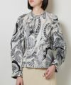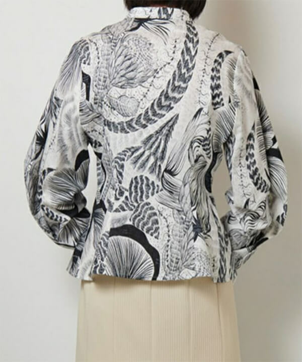デザイナーの深山氏が鉛筆画を描き、線の強弱も繊細に再現する技法を模索しながら作り上げた手捺染プリントのブラウス。
