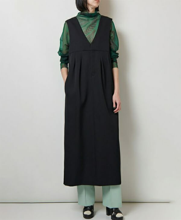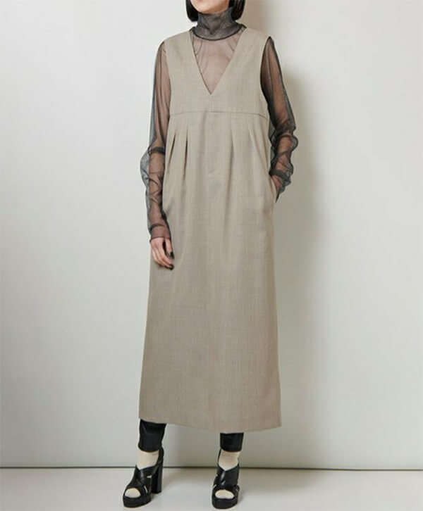 トレンドアイテムのジャンパースカートは、幼くならないようIラインシルエットですっきりと。