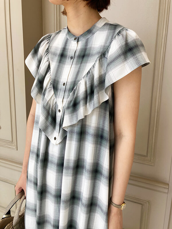 同素材のフリルの付け襟を付けて胸元にボリューム感を持たせました。首元から胸元が寂しくなりがちなウェーブさんには持ってこいのデザインです。