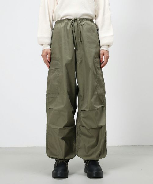 メンズ、レディースともに人気の軍パンです。ウエストと裾はドローストリング仕様で、フラップポケットやバックスタイルのドローコード、小股のループなど当時のディテールを採用しながらもHYKEらしいシルエットに仕上げた1枚。