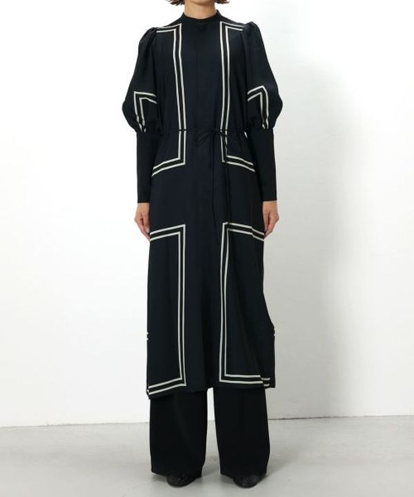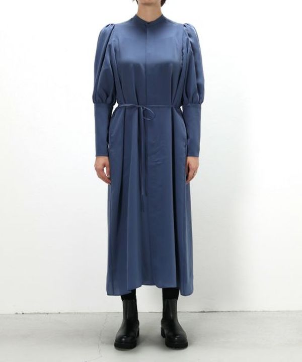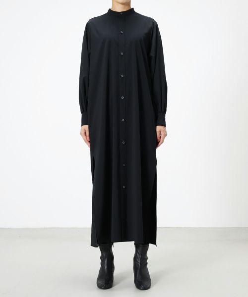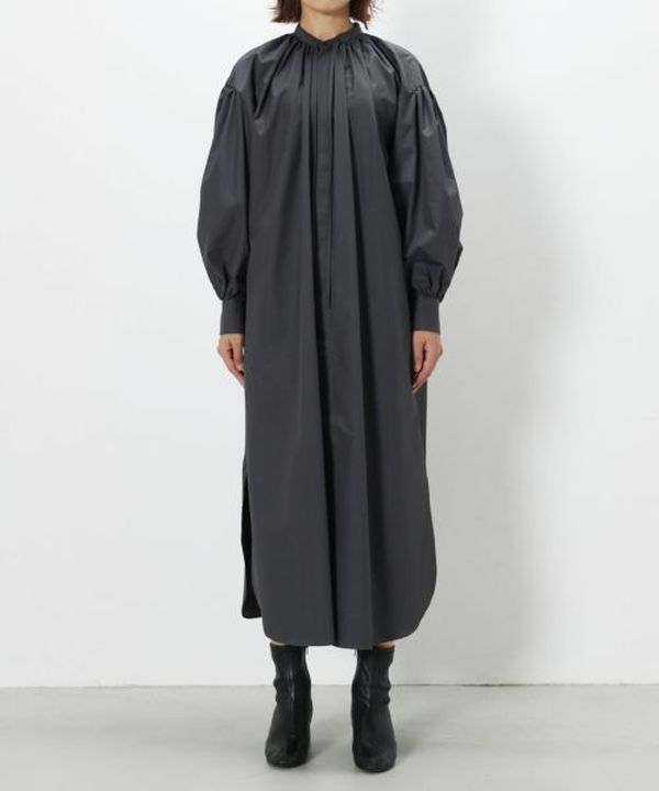 HYKE(ハイク)のスタンドカラー仕様のシャツワンピース。長めの着丈とボリュームスリーブが特徴です。バックスタイルのギャザーが女性らしい動きと質感をプラスしてくれます。