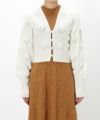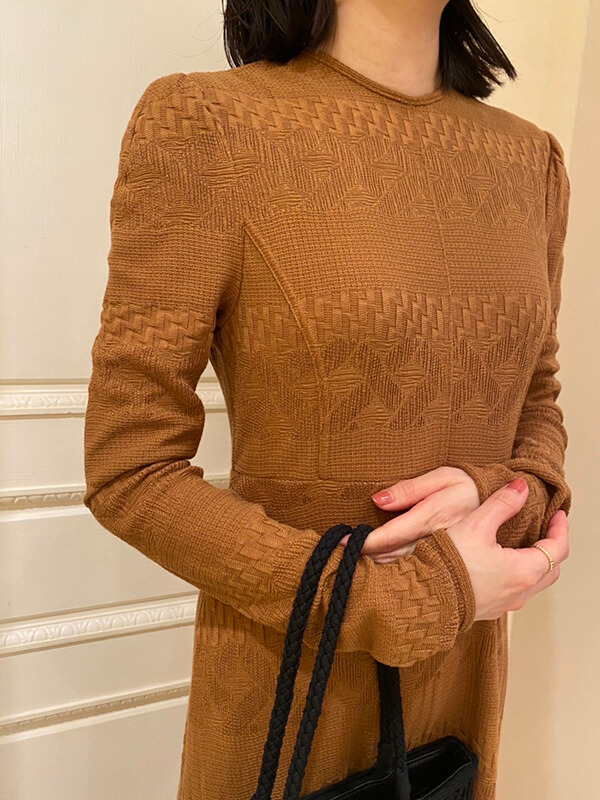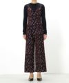 ぽこぽこ立体的な編み地が特徴のカーディガンとFloral Jacquardシリーズのジャンプスーツを合わせたスタイリング。