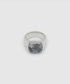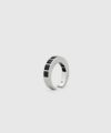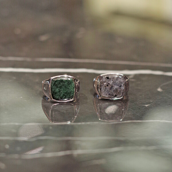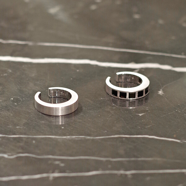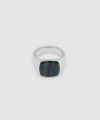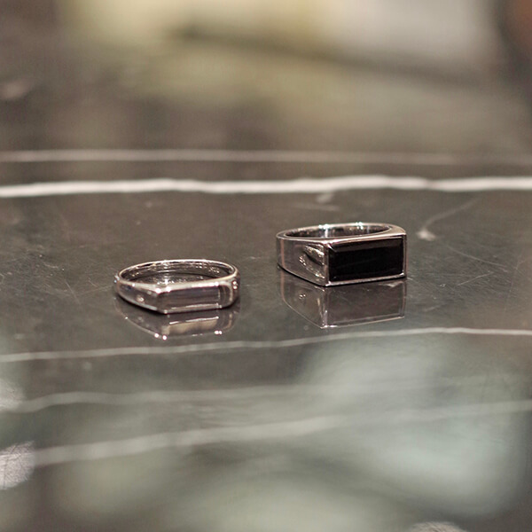 ポリッシュ仕上げのブラックオニキスが存在感を放つリング(画像右側)で、直線的なシルエットが洗練された印象のスリムシグネットリングです。