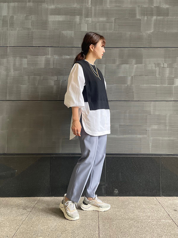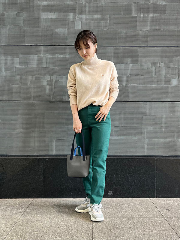 パンツもスニーカーのトーンと合わせたニュアンスカラーで、トレンド感のあるコーディネートに。
