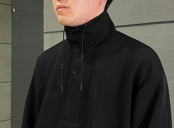 プルオーバーといえば一見カジュアルに見えますが、湾曲した袖のパターンで、パンツの合わせ方次第ではモードな雰囲気にも持っていける1着です。