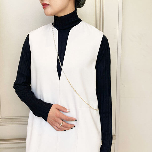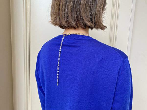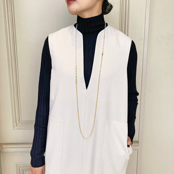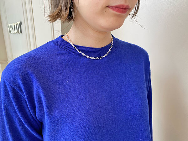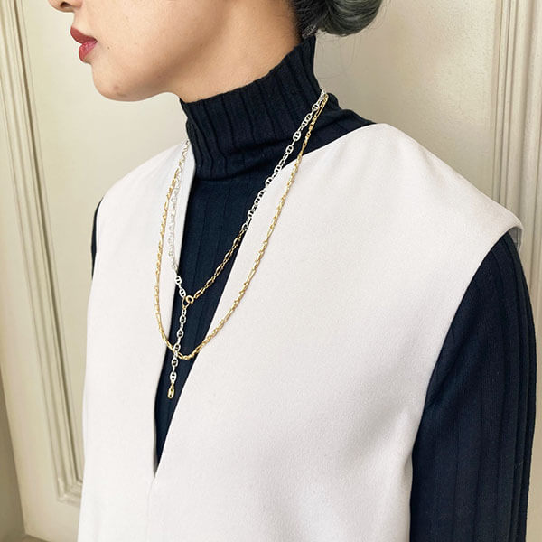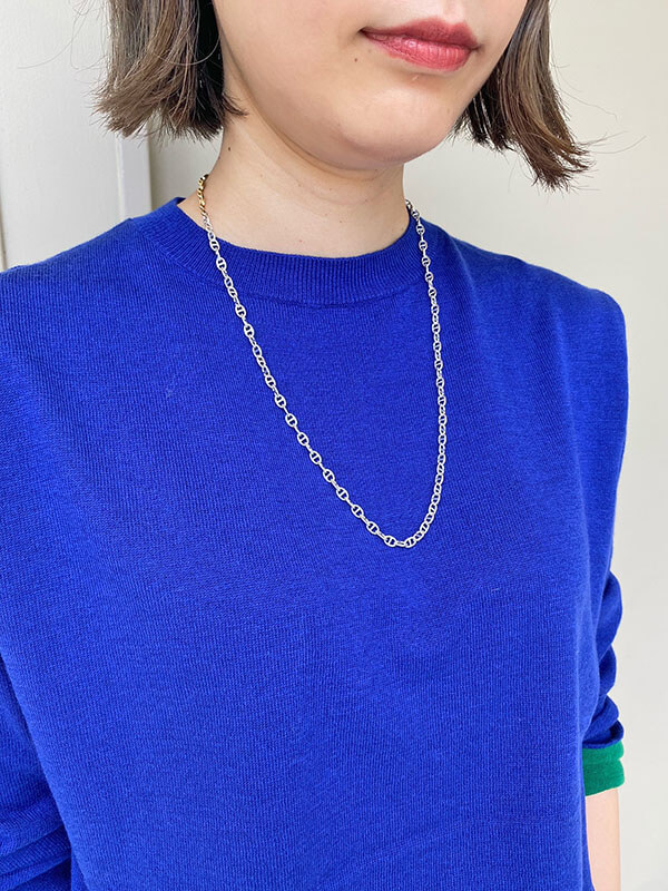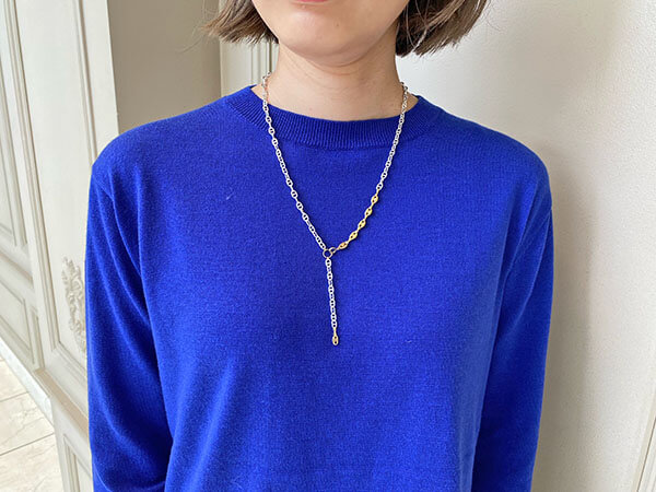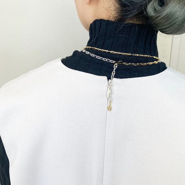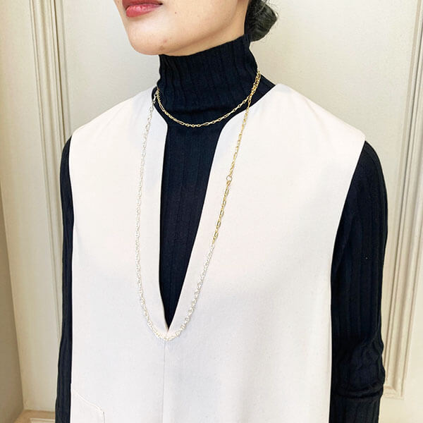 1本1本チェーン全ての箇所にジョイントして頂く事が可能なため、 それぞれチョーカー・ラリエット・ミドル丈ネックレスいろんな長さでつける事ができる!