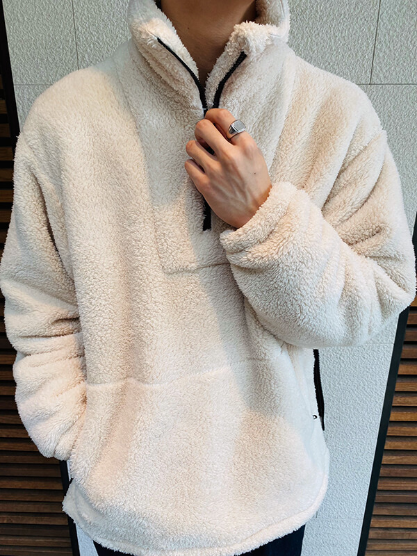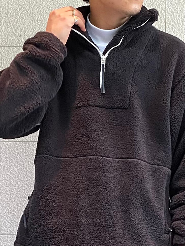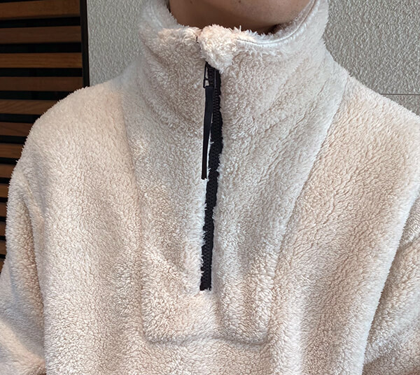 お次はこちらのアイテムの魅力ですが、普通のボアジャケットとは違いプルオーバータイプとなっておりますので1枚で様になるデザインです。