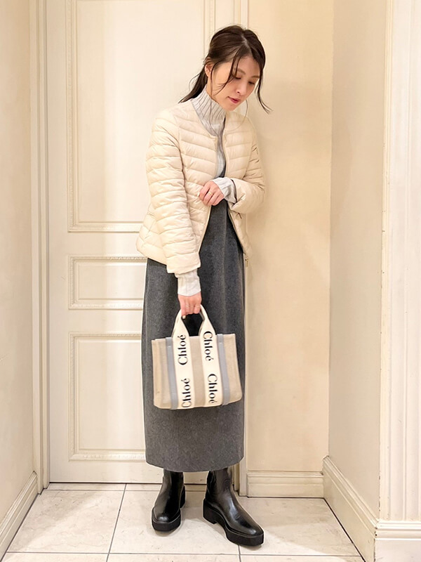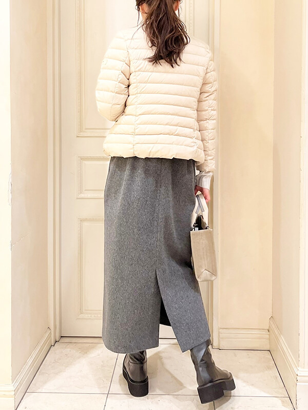 肩の張りを極力抑え、メリハリが出るようにウエストラインもきゅっと絞られているデザインになっており、全体的コンパクトな印象のダウンです。