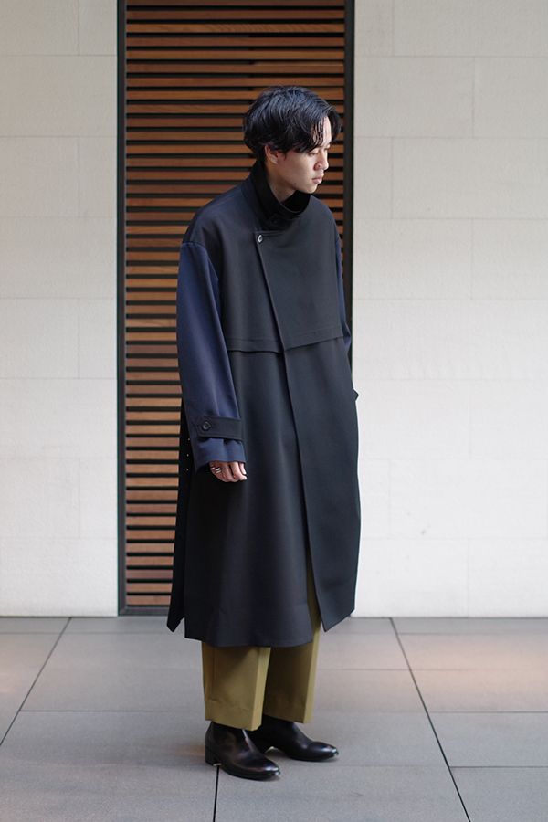 アームベルトはそのままに、両袖部分をネイビーに変えることで、よりクルニらしさの引き立つ魅力的なコートに仕上がっています。