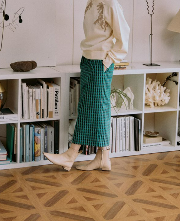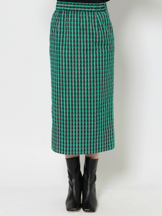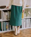 さらに、スタイリングをぐっと華やかにしてくれるグリーンが目をひくチェックスカートも。