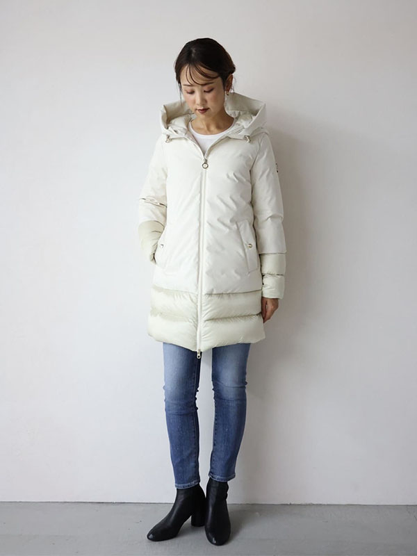 フードについた大ぶりなファーがついたエレガントな雰囲気のQUINAもラインナップ。ミドル丈なので防寒性も抜群です。ウエストの両サイドはダウン幅が細く切り替えられており、スタイルアップ効果もしっかりあります。
