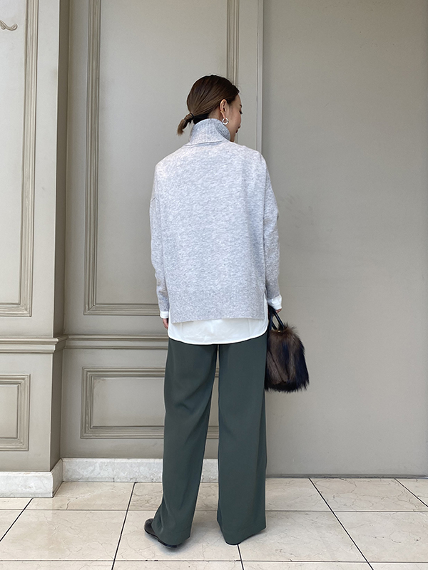 ボトムにスモーキーなカーキワイドパンツを合わせて大人カジュアルコーディネートに。