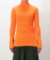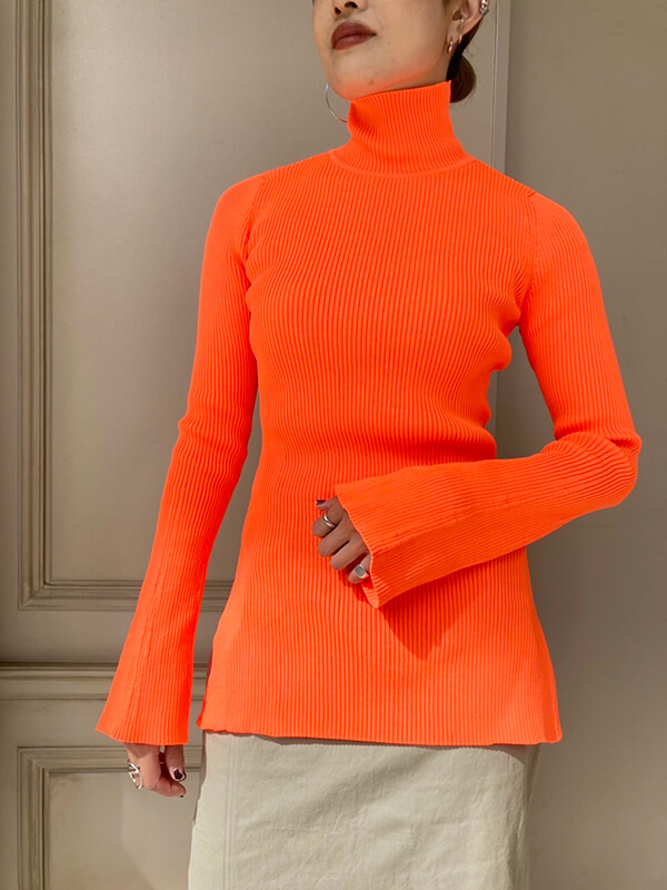 くすみオレンジのアウター、ベージュのスカート、ブラウンのブーツとのナチュラルなトーンのカラーに、ネオンカラーのニットを差して新鮮なカラーバランスに仕上げたのがポイントです!