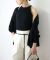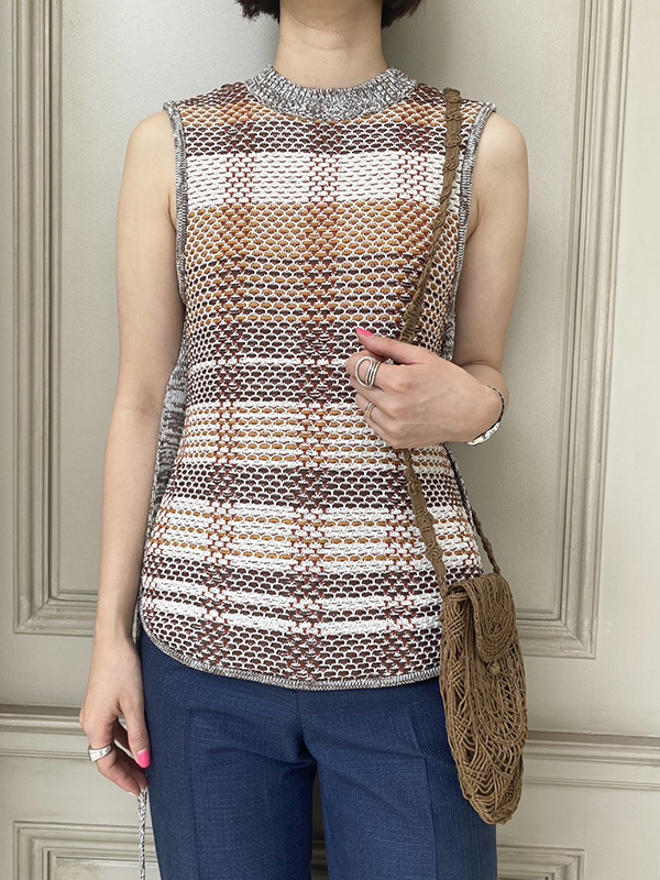 お次は、お車移動の多いドアtoドアの方や、あまり外を歩く事の少ない日にオススメのスタイル!!一目見て、マメと分かる色遣いと細部のデザイン。袖部分に、肌見せの抜きを作ることで、見た目以上に涼しくシーズン長く楽しめるコットンニットに仕上がっています。デコルテや袖から素肌がみえ、ヘルシーな印象に!編み地を見ても工芸作品のような仕上がりになっており、着ているだけで気分のあがる1着です♪冷房の効いた場所をメインで過ごされる方には真夏もちょうど良いアイテムです!