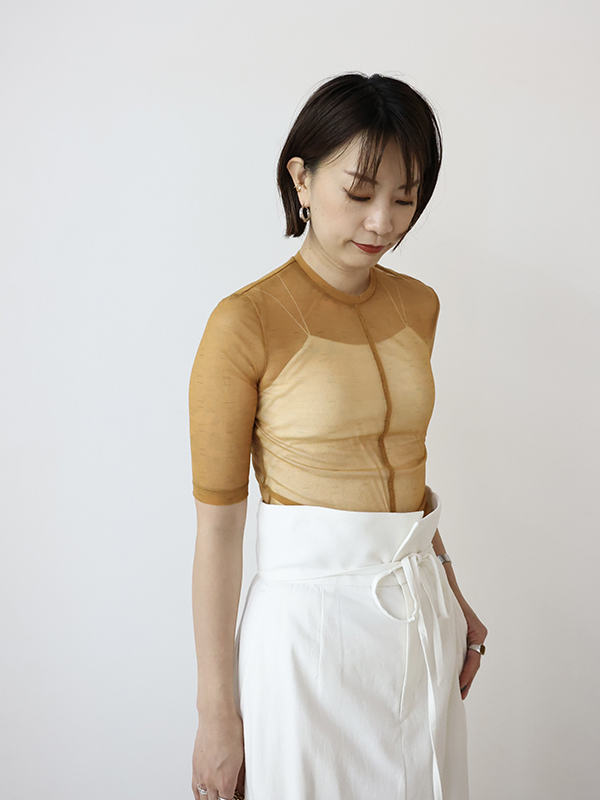 まずは、今シーズン外せないシアーアイテムを、色違いで2コーデ!マメのシアートップスは、世界中どこを探しても日本の1社のみでしか成し得ない手作業のプリント技術により完成した1枚です!