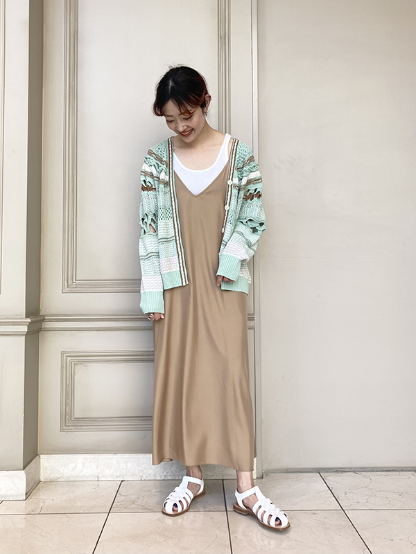 ミントグリーンに、キャメルベージュのカラー配色が◎とろみのあるキャミワンピと合わせるとエアリーな印象に仕上がります。ホワイトをアクセントに取り入れるのが吉!