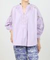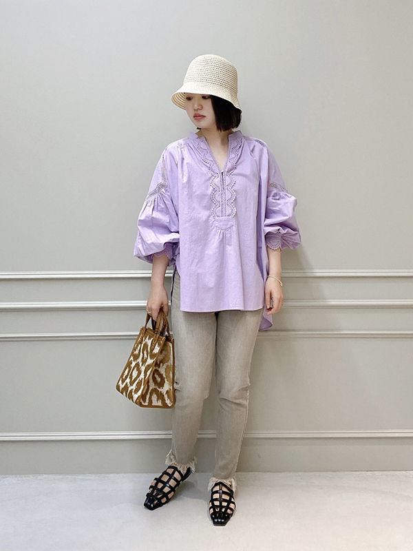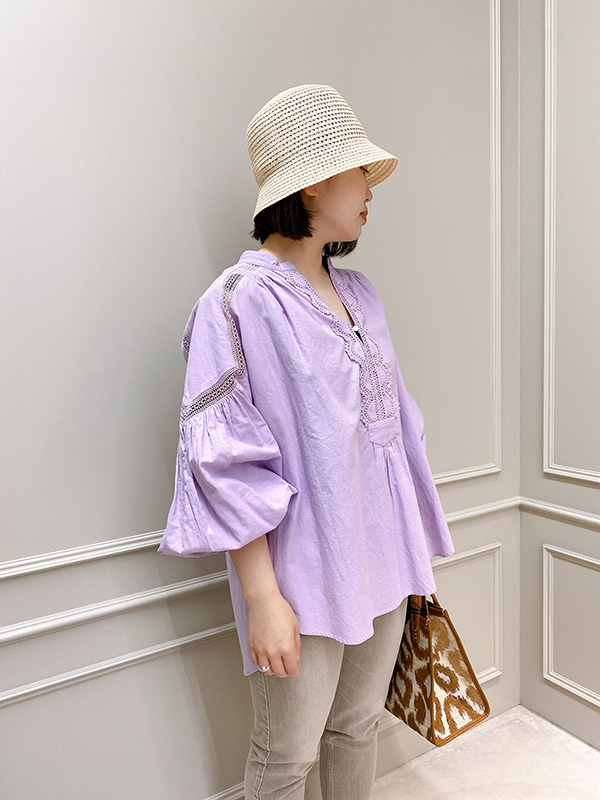 ハリのある素材感のブラウスが身体を包み込んでくれ、立体的なフォルムが美しいブラウスです。肌触りも良く、胸元や肩回りのレースが華やかです。