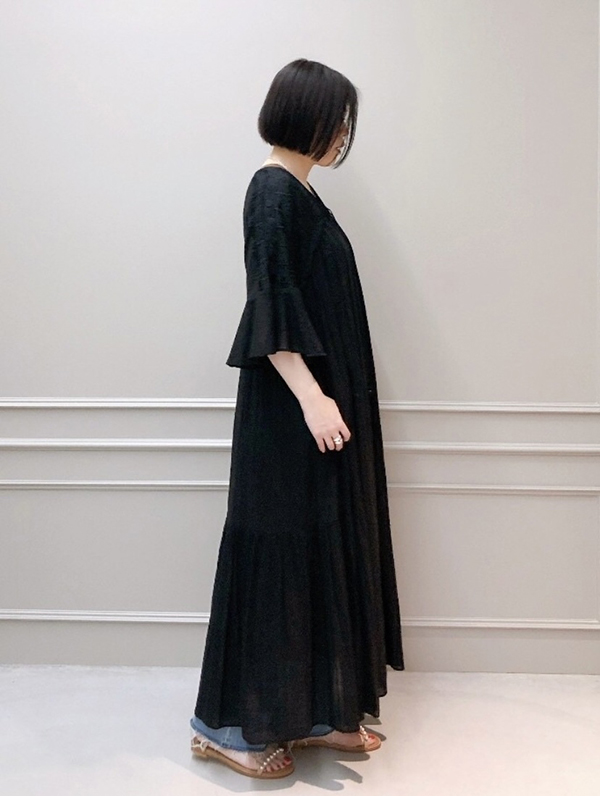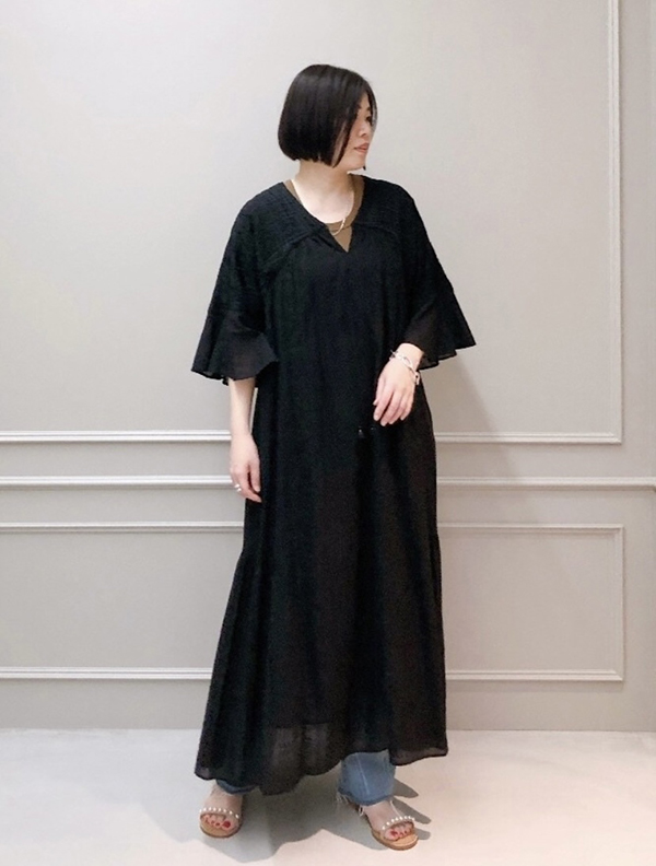 最後は、細やかなテクニックが際立つモードなブラックワンピース×淡いデニムのコーディネート!