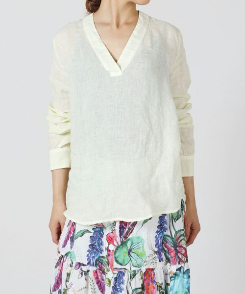 Vネックのチュニックシャツはパンツとスカートどちらとも相性抜群。