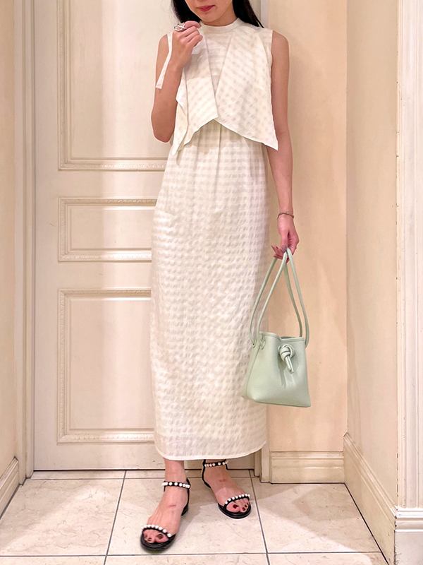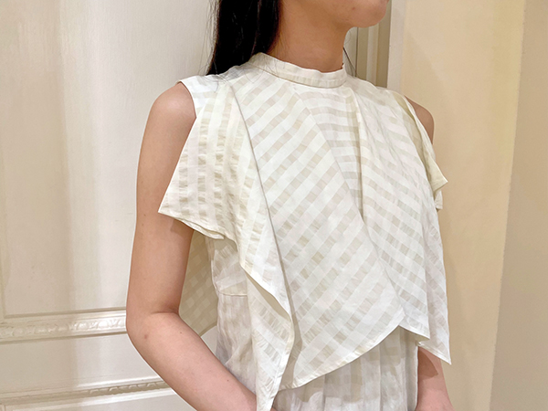 ノースリーブのシンプルな形に、四角い布によって作られたドレープがポイントに。