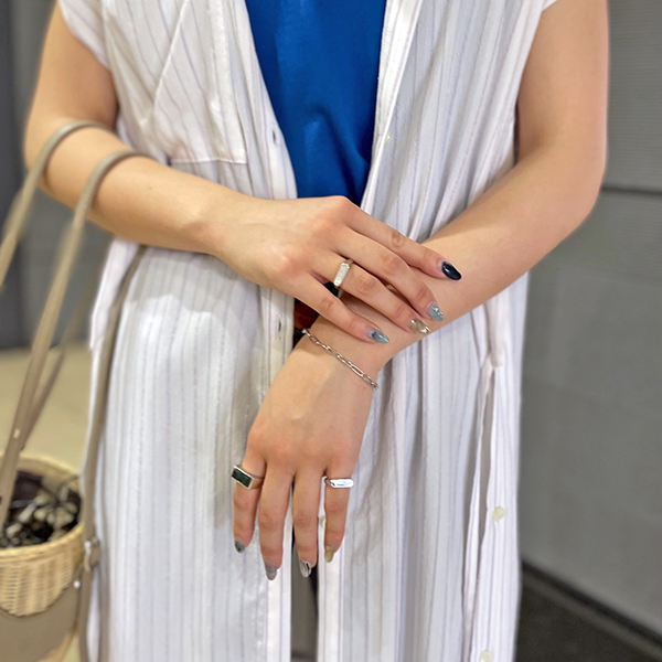 今回人差し指に付けたPeaky Ring Green Marble(ピンキーリンググリーンマーブル)は緊張やストレスを和らげる、明瞭さと自制心、安定性、安らぎなど意味が持っています。日頃のストレスなども癒してくれるリングなので1つ身につけるだけでも心が明るくなりますよ。