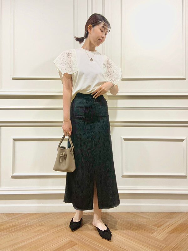 ぷっくりとしたアッパー部分と華奢なヒールが上品な足元を演出してくれます。