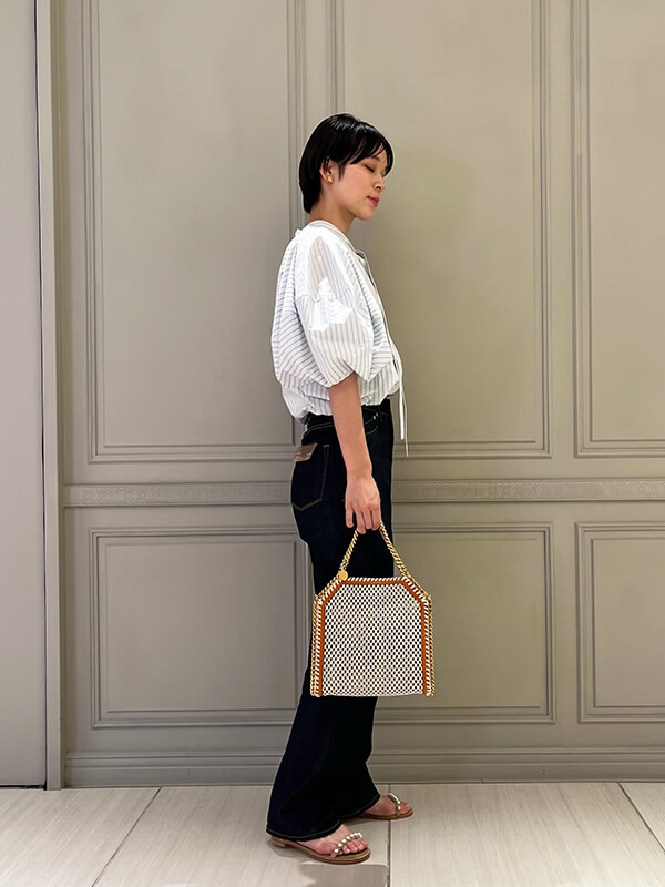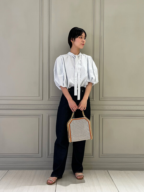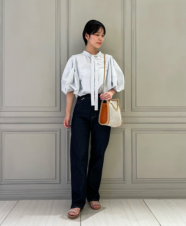 デニムとパフスリーブのシャツと合わせ、カジュアルなアイテムと合わせてみました。
