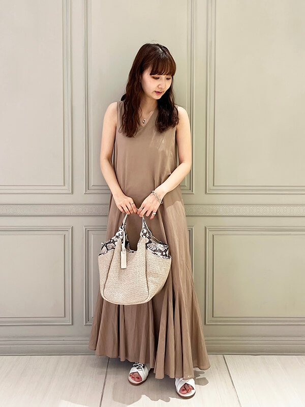 女性らしいAラインに広がるMARIHA(マリハ)のワンピースにMARCO MASI(マルコマージ)のラフィア素材のバックで、ナチュラルな雰囲気にワントーンでコーディネートしてみました!