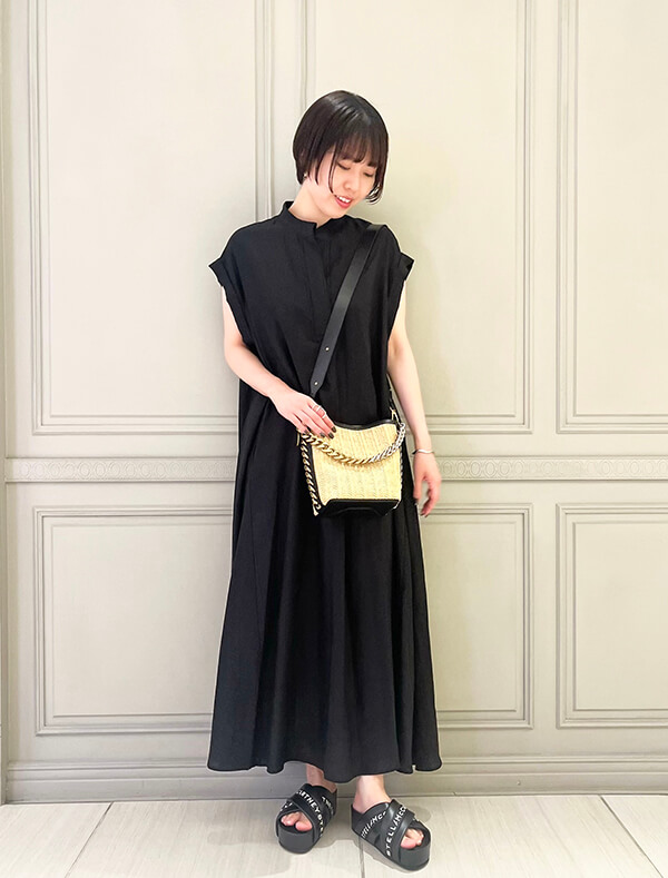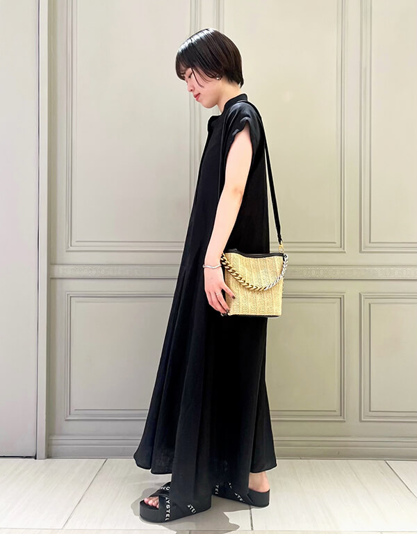 ブラックのリネンワンピースと合わせて、モノトーンでモードなコーディネートにしてみました。