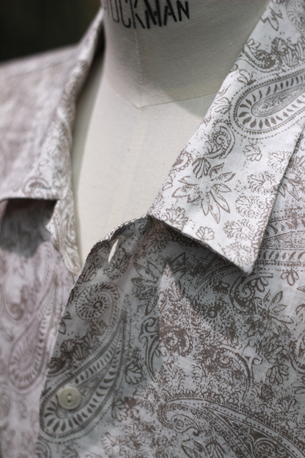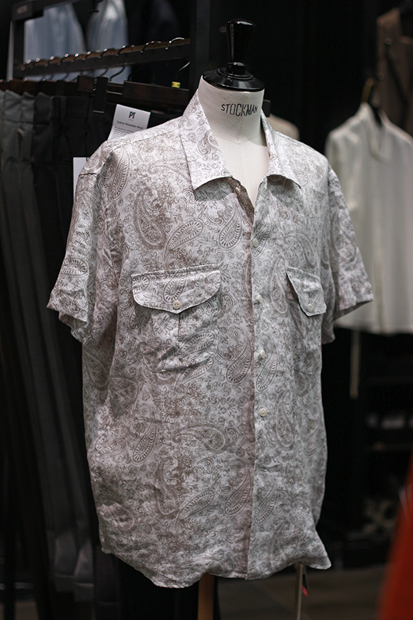 ペイズリーのやや華やかな柄行きながら、白とベージュの上品な色使いが好印象なシャツです。