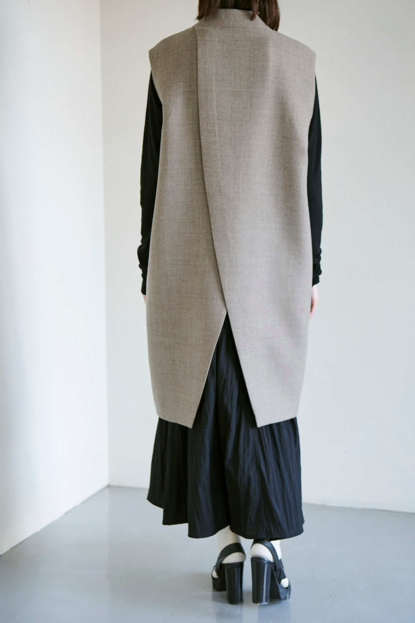 続いて、コレクションでお馴染みの顔ぶれとなりつつあるバックスラッシュジレですが、今季はふっくらとしたウールのダブルクロス生地にアップデートされました!