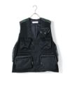 前身頃がフィッシングベストの様なクラシカルな表情でありながら、後ろ身頃はコーティングナイロンで切り替えしたクラシックとモードが見事に融合したベストはトーガならではです。フロントのポケットは合計で7つあり、デザインアクセントになることはもちろん、収納力も兼ね備えています。