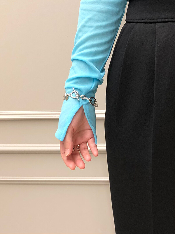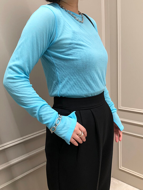 1枚で着用してもサマになるのですが、今回はシアーカットソーを重ね着して、手首からチラ見せさせてみました。カラーがポイントになって可愛いです!