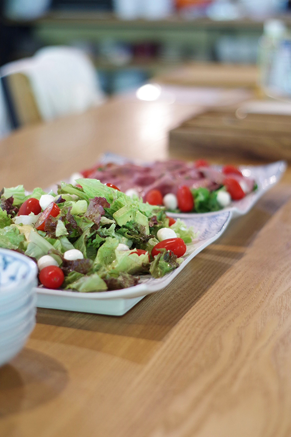 レディースメンバーは室内で焼き物、サラダなどの準備を着々と。