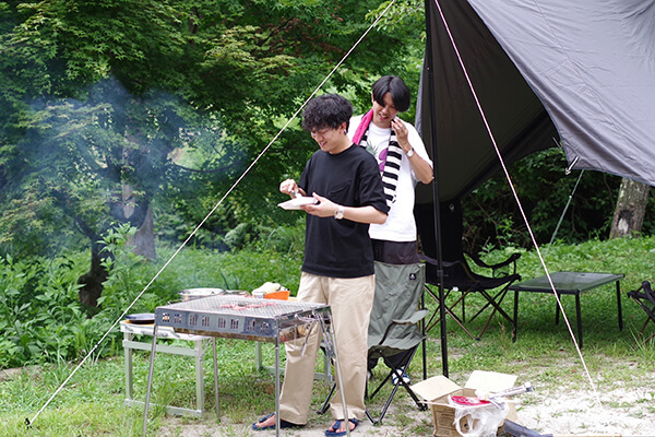 着いて早々、アブの多さにビビりながらも火おこしにテント設営に、テキパキ動く頼もしいメンズメンバー。