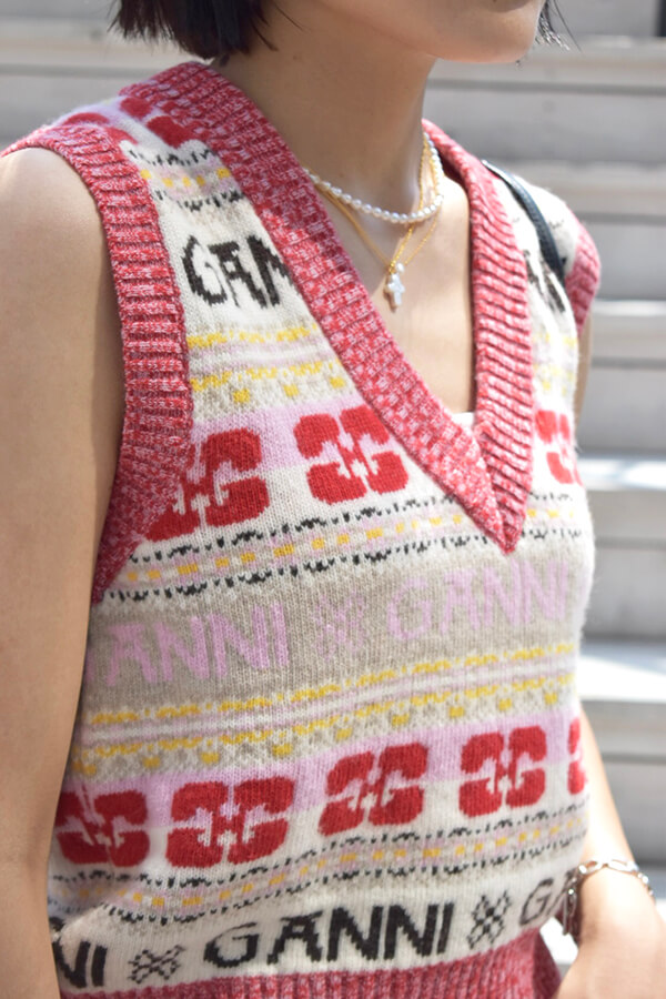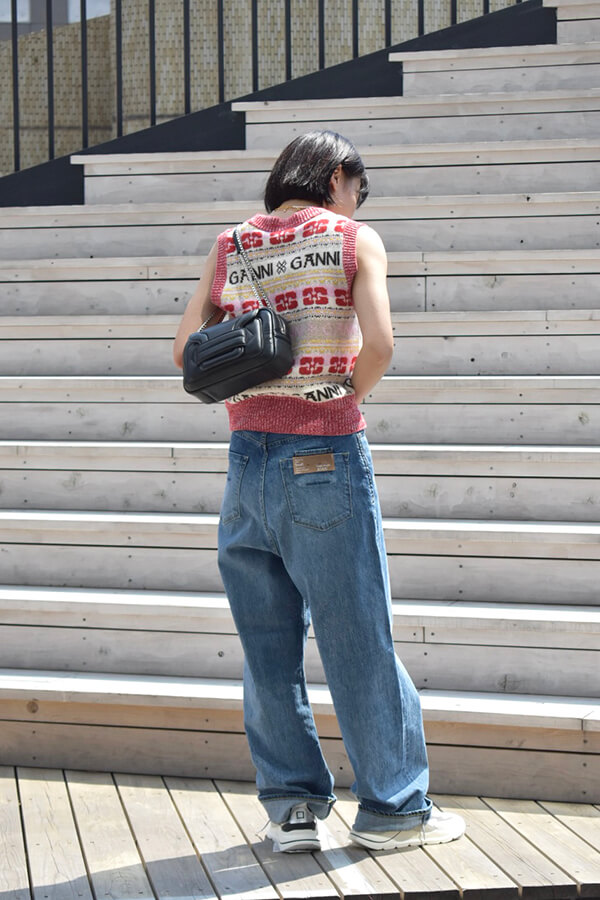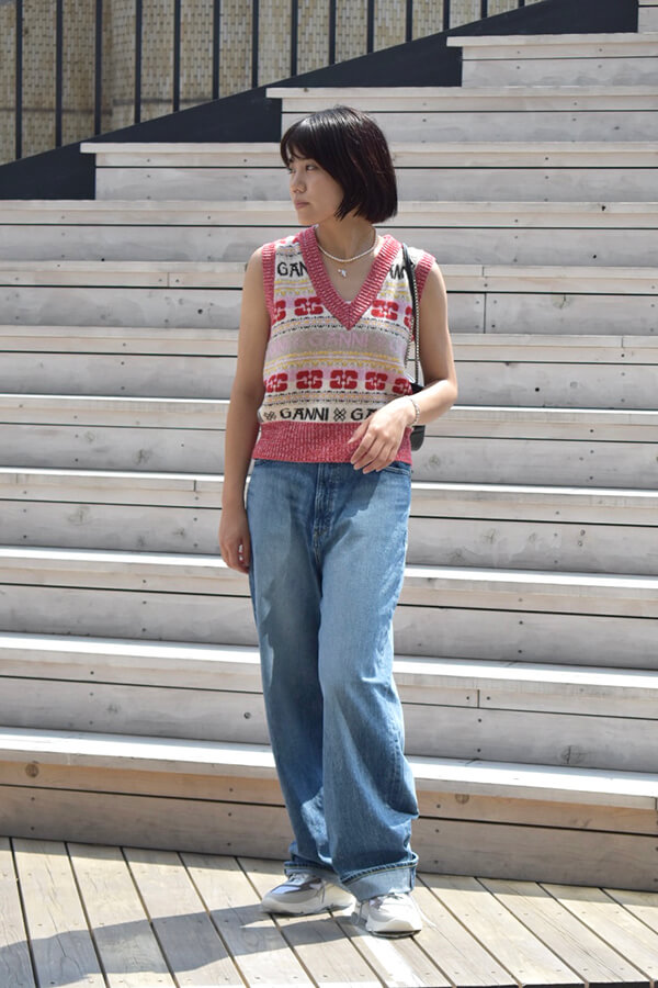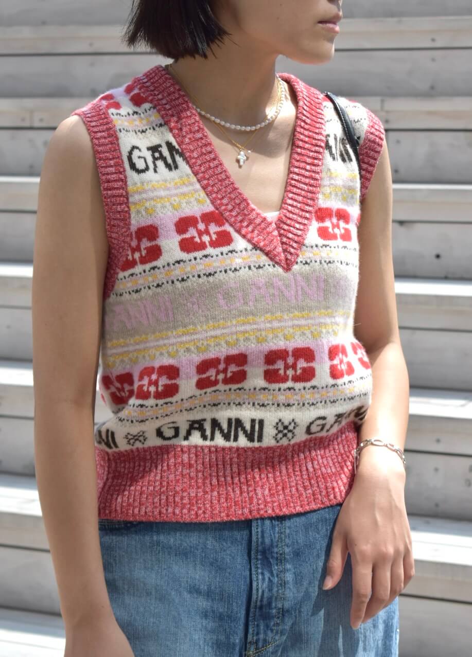 GANNIのロゴニットベストと、ワイドシルエットのデニムを合わせて見ました。