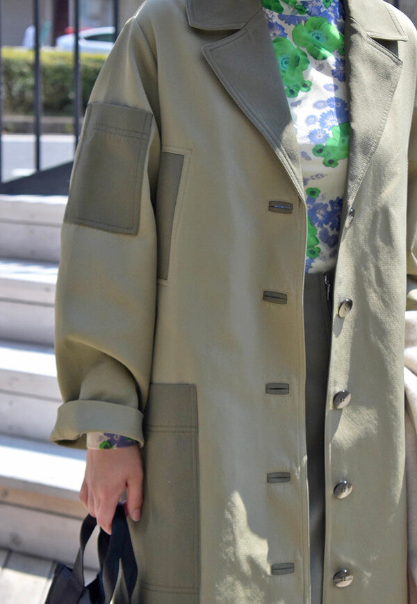 異なるカラーのポケットやラペルが特徴のこのコートは、見た目以上にゆったりと着て頂けるところがポイント。厚手のニットの上からでも余裕を持って着用いただけます♪