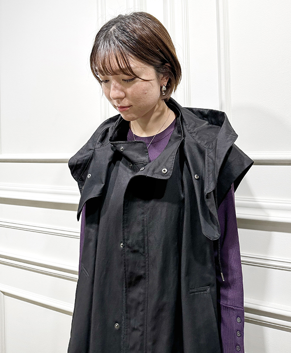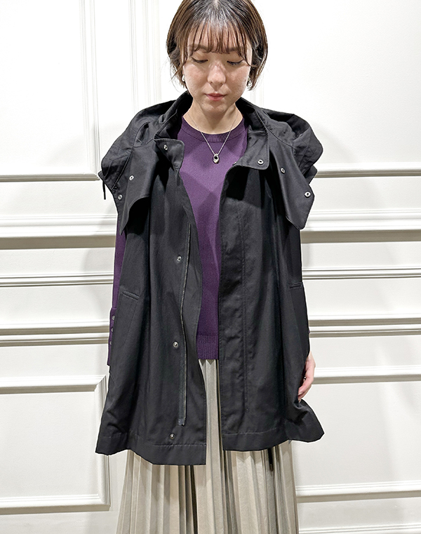 高めの位置に設定されたフード付きの襟は取り外しが可能で、違った印象でご着用いただくことができます。