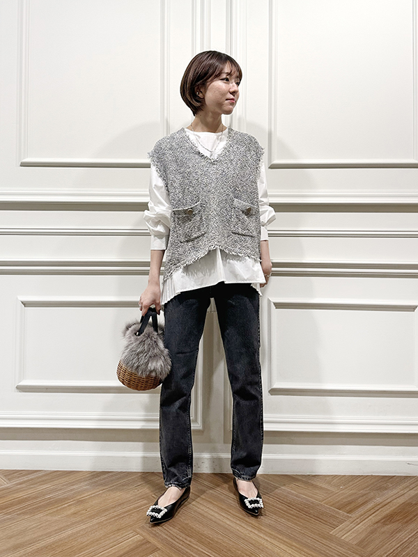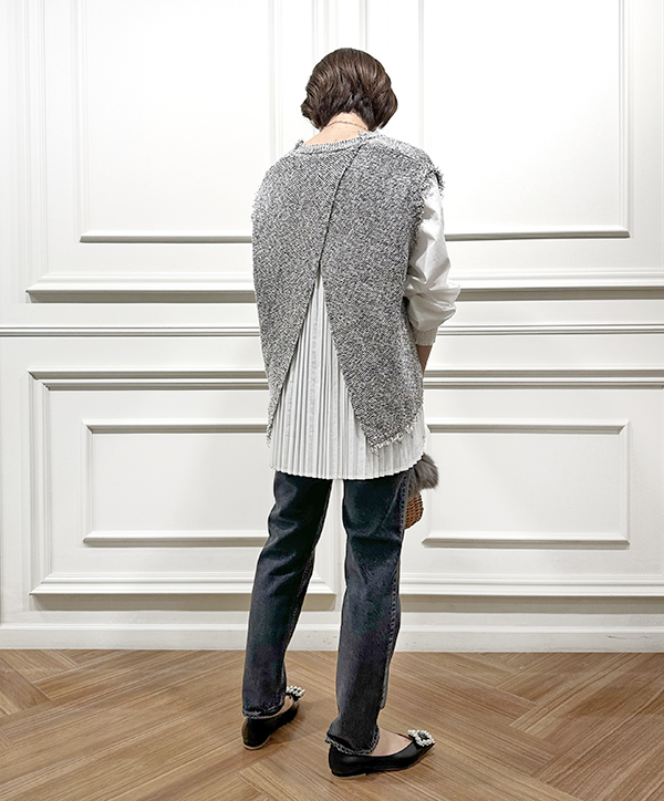 トレンド感のあるツイード調のベストと、バックスタイルが美しいシャツがセットになったアイテム。