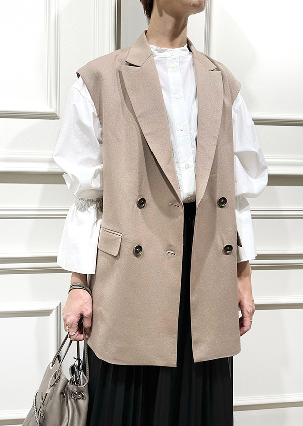 ベストの中に合わせているのが、袖口にデザイン性のあるバンドカラーのブラウス。袖が見えるベストだからこそ、合わせたいアイテムです。