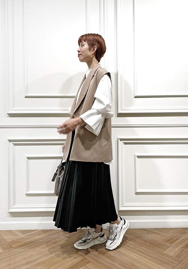 ベストの素材感やシャツのプリーツを活かすようにパンツはシルエットの綺麗なストレートをチョイス。