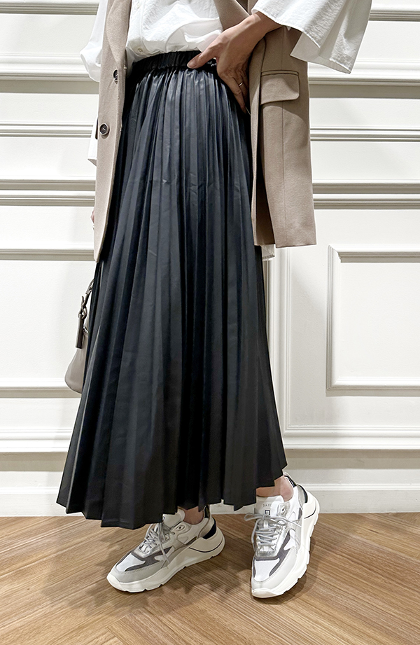 ボトムスには昨年も人気だったエコレザーのプリーツスカートを。