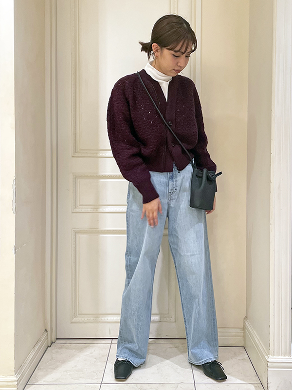 今回のコーディネートは大人っぽいシックな色のカーディガンなので、淡い色のデニムで少しカジュアルダウンしてみました。