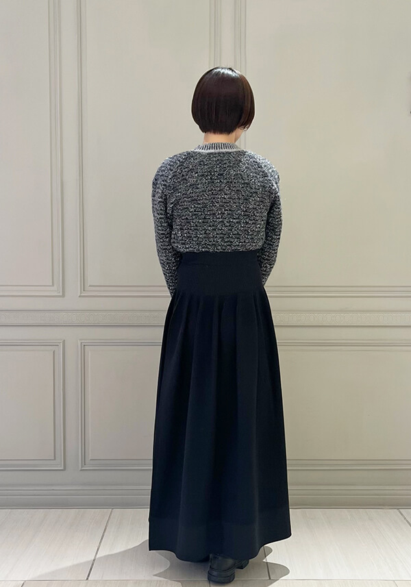 その名の通り、ウエスト下からの細かいギャザーとたっぷりとしたフレアで、身体のラインを拾わずそっと包み込んでくれる様な綺麗なシルエットです。