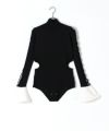 くびれ部分をカットアウトさせたボディスーツは、アーム部分にもテクニックが効いています。