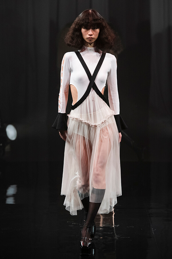 不規則な柄や編地からユニークな美しさを探求し、京都で生み出されたストライプペイントのドレスがコレクションを彩っています。