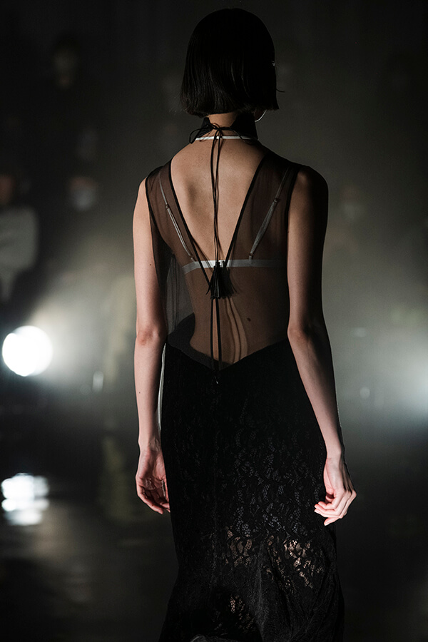 1920年のフラッパードレスで象徴的なローウエストのシルエットは、ウールのボンディングコートや、フロッキー加工を施したレースのロングドレスにも採用されています。