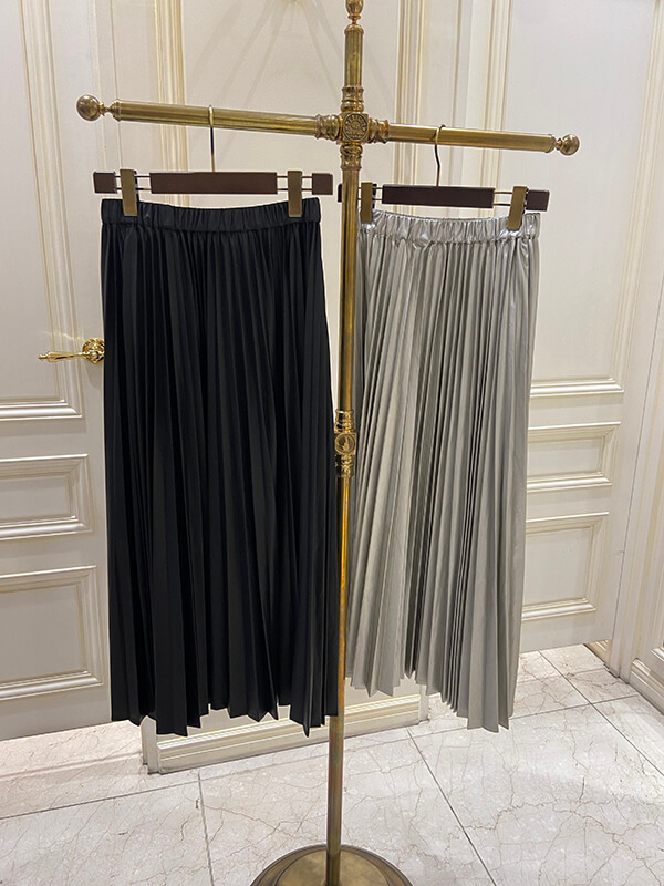 レザーにしか出せないカチッとしたプリーツは、歩くと揺れて少しモードな雰囲気も。