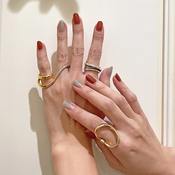 シャルロットシェネのリングは大ぶりながらも、実際に付けてみるとすっと馴染んでくれるので、アクセントとし取り入れるのも、重ね付けして手元を華やかにするのにもおすすめです。