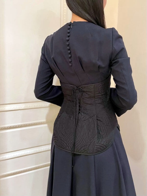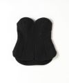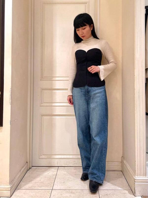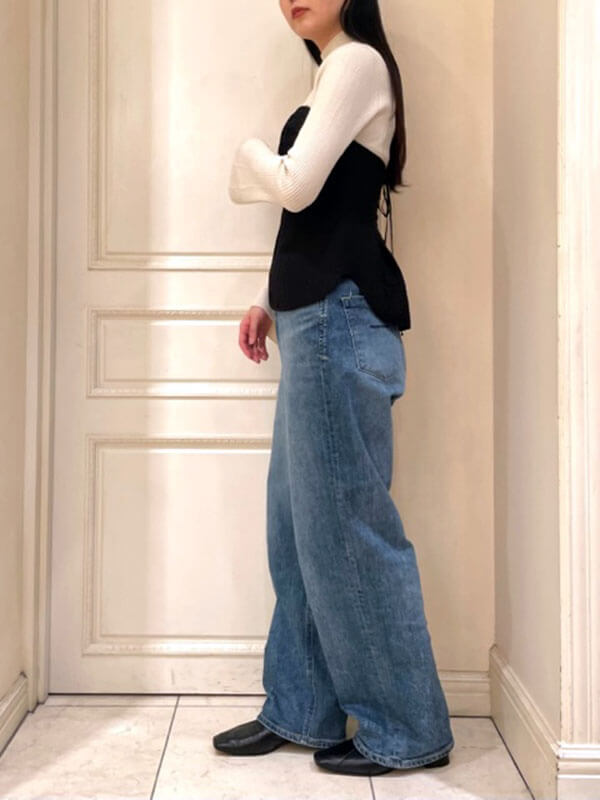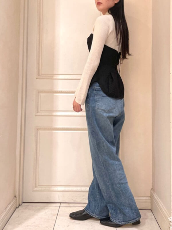 ここで見て頂きたいのは360度美しいシルエット。前身頃はすっきりとしているのですが、後ろはレースアップのディテールによりペプラムのように広がります。後ろの紐部分で身幅を調整できるのでカットソーからニットまで様々なトップスとレイヤードして頂けます。私は窮屈なのが苦手なので2のサイズをきゅっっと絞って着ています。フロントのホックで脱ぎ着できるのも嬉しいポイントです◎
